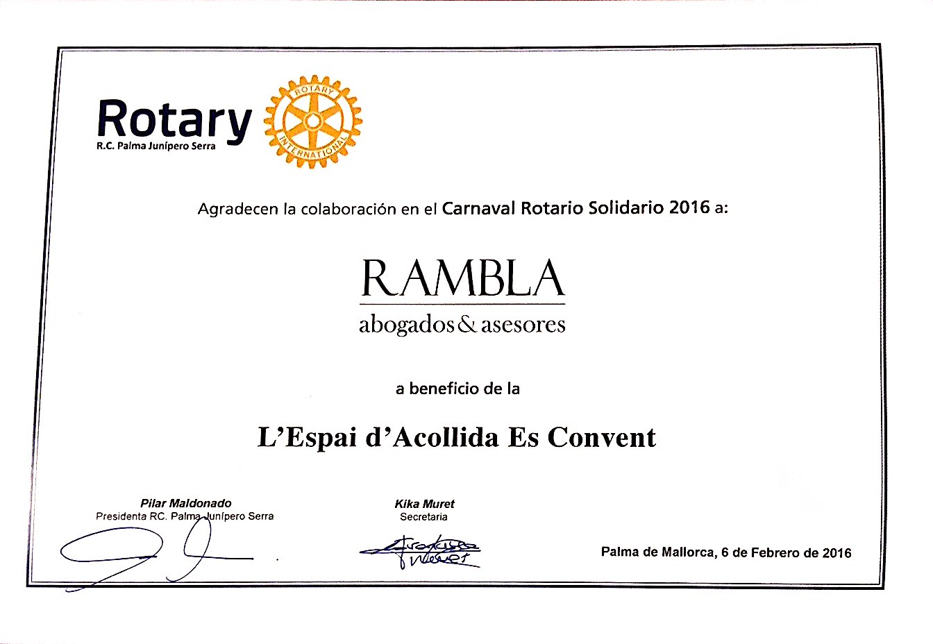 El sábado 6 de Febrero de 2016, el Rotary Club Palma Junípero Serra celebró la decimoquinta edición de su ya tradicional  carnaval solidario. Este año el resultado de la recaudación se destinará a  L’Espai d’Acollida Es Convent,  de la Fundació Sant Joan de Déu.